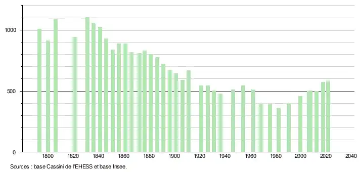 L'évolution du nombre d'habitants est connue à travers les recensements de la population effectués dans la commune depuis 1793. Pour les communes de moins de 10 000 habitants, une enquête de recensement portant sur toute la population est réalisée tous les cinq ans, les populations légales des années intermédiaires étant quant à elles estimées par interpolation ou extrapolation[21]. Pour la commune, le premier recensement exhaustif entrant dans le cadre du nouveau dispositif a été réalisé en 2007[22].
