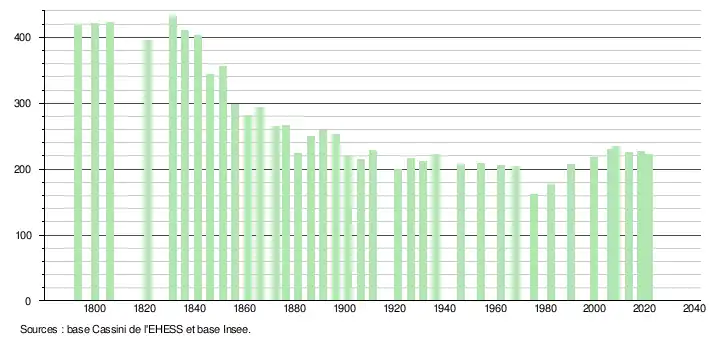 L'évolution du nombre d'habitants est connue à travers les recensements de la population effectués dans la commune depuis 1793. Pour les communes de moins de 10 000 habitants, une enquête de recensement portant sur toute la population est réalisée tous les cinq ans, les populations légales des années intermédiaires étant quant à elles estimées par interpolation ou extrapolation[20]. Pour la commune, le premier recensement exhaustif entrant dans le cadre du nouveau dispositif a été réalisé en 2008[21].