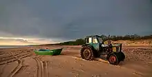 La côte près de Užavas dans le Ventspils. Un tracteur et une barque sur la plage. Mai 2018.
