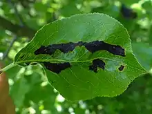 Tavelure sur feuilles, due à Venturia pyrina.