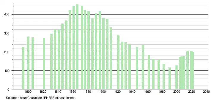 L'évolution du nombre d'habitants est connue à travers les recensements de la population effectués dans la commune depuis 1793. Pour les communes de moins de 10 000 habitants, une enquête de recensement portant sur toute la population est réalisée tous les cinq ans, les populations légales des années intermédiaires étant quant à elles estimées par interpolation ou extrapolation[11]. Pour la commune, le premier recensement exhaustif entrant dans le cadre du nouveau dispositif a été réalisé en 2004[12].