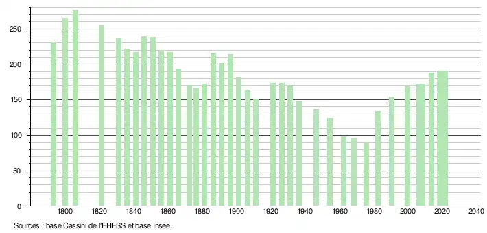 L'évolution du nombre d'habitants est connue à travers les recensements de la population effectués dans la commune depuis 1793. Pour les communes de moins de 10 000 habitants, une enquête de recensement portant sur toute la population est réalisée tous les cinq ans, les populations légales des années intermédiaires étant quant à elles estimées par interpolation ou extrapolation[15]. Pour la commune, le premier recensement exhaustif entrant dans le cadre du nouveau dispositif a été réalisé en 2008[16].