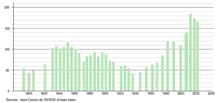 L'évolution du nombre d'habitants est connue à travers les recensements de la population effectués dans la commune depuis 1793. Pour les communes de moins de 10 000 habitants, une enquête de recensement portant sur toute la population est réalisée tous les cinq ans, les populations légales des années intermédiaires étant quant à elles estimées par interpolation ou extrapolation[18]. Pour la commune, le premier recensement exhaustif entrant dans le cadre du nouveau dispositif a été réalisé en 2007[19].