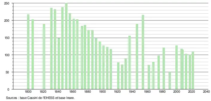 L'évolution du nombre d'habitants est connue à travers les recensements de la population effectués dans la commune depuis 1800. Pour les communes de moins de 10 000 habitants, une enquête de recensement portant sur toute la population est réalisée tous les cinq ans, les populations légales des années intermédiaires étant quant à elles estimées par interpolation ou extrapolation[16]. Pour la commune, le premier recensement exhaustif entrant dans le cadre du nouveau dispositif a été réalisé en 2007[17].