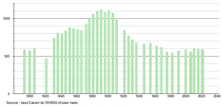 L'évolution du nombre d'habitants est connue à travers les recensements de la population effectués dans la commune depuis 1793. Pour les communes de moins de 10 000 habitants, une enquête de recensement portant sur toute la population est réalisée tous les cinq ans, les populations légales des années intermédiaires étant quant à elles estimées par interpolation ou extrapolation[16]. Pour la commune, le premier recensement exhaustif entrant dans le cadre du nouveau dispositif a été réalisé en 2005[17].