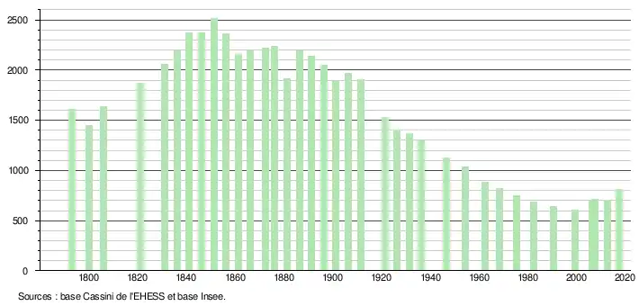 L'évolution du nombre d'habitants est connue à travers les recensements de la population effectués dans la commune depuis 1793. Pour les communes de moins de 10 000 habitants, une enquête de recensement portant sur toute la population est réalisée tous les cinq ans, les populations légales des années intermédiaires étant quant à elles estimées par interpolation ou extrapolation[11]. Pour la commune, le premier recensement exhaustif entrant dans le cadre du nouveau dispositif a été réalisé en 2007[12].