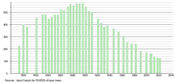 L'évolution du nombre d'habitants est connue à travers les recensements de la population effectués dans la commune depuis 1793. Pour les communes de moins de 10 000 habitants, une enquête de recensement portant sur toute la population est réalisée tous les cinq ans, les populations légales des années intermédiaires étant quant à elles estimées par interpolation ou extrapolation[22]. Pour la commune, le premier recensement exhaustif entrant dans le cadre du nouveau dispositif a été réalisé en 2007[23].