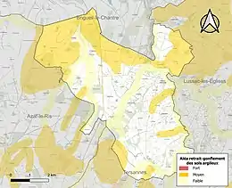 Le retrait-gonflement des sols argileux est susceptible d'engendrer des dommages importants aux bâtiments en cas d'alternance de périodes de sécheresse et de pluie[17]. 34,9 % de la superficie communale est en aléa moyen ou fort (27 % au niveau départemental et 48,5 % au niveau national métropolitain)[Carte 2]. Depuis le , en application de la loi ÉLAN, différentes contraintes s'imposent aux vendeurs, maîtres d'ouvrages ou constructeurs de biens situés dans une zone classée en aléa moyen ou fort[Note 2],[18].