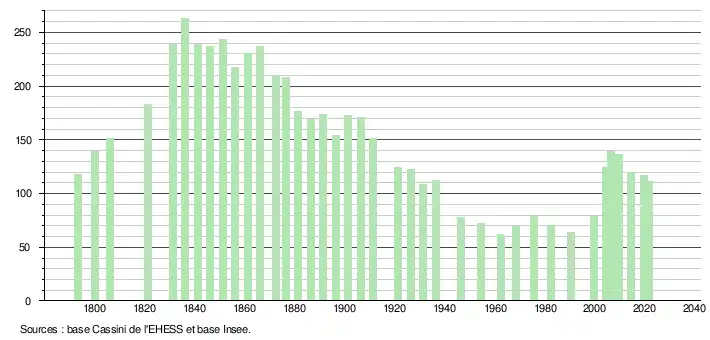 L'évolution du nombre d'habitants est connue à travers les recensements de la population effectués dans la commune depuis 1793. Pour les communes de moins de 10 000 habitants, une enquête de recensement portant sur toute la population est réalisée tous les cinq ans, les populations légales des années intermédiaires étant quant à elles estimées par interpolation ou extrapolation[15]. Pour la commune, le premier recensement exhaustif entrant dans le cadre du nouveau dispositif a été réalisé en 2004[16].