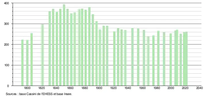 L'évolution du nombre d'habitants est connue à travers les recensements de la population effectués dans la commune depuis 1793. Pour les communes de moins de 10 000 habitants, une enquête de recensement portant sur toute la population est réalisée tous les cinq ans, les populations légales des années intermédiaires étant quant à elles estimées par interpolation ou extrapolation[28]. Pour la commune, le premier recensement exhaustif entrant dans le cadre du nouveau dispositif a été réalisé en 2008[29].