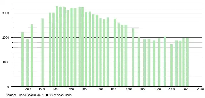 L'évolution du nombre d'habitants est connue à travers les recensements de la population effectués dans la commune depuis 1793. Pour les communes de moins de 10 000 habitants, une enquête de recensement portant sur toute la population est réalisée tous les cinq ans, les populations légales des années intermédiaires étant quant à elles estimées par interpolation ou extrapolation[18]. Pour la commune, le premier recensement exhaustif entrant dans le cadre du nouveau dispositif a été réalisé en 2006[19].