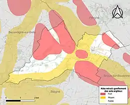 Les mouvements de terrains susceptibles de se produire sur la commune sont des tassements différentiels[17]. Le retrait-gonflement des sols argileux est susceptible d'engendrer des dommages importants aux bâtiments en cas d’alternance de périodes de sécheresse et de pluie[18]. 70,9 % de la superficie communale est en aléa moyen ou fort (54,9 % au niveau départemental et 48,5 % au niveau national)[Carte 2]. Depuis le , en application de la loi ELAN, différentes contraintes s'imposent aux vendeurs, maîtres d'ouvrages ou constructeurs de biens situés dans une zone classée en aléa moyen ou fort[Note 3],[19].