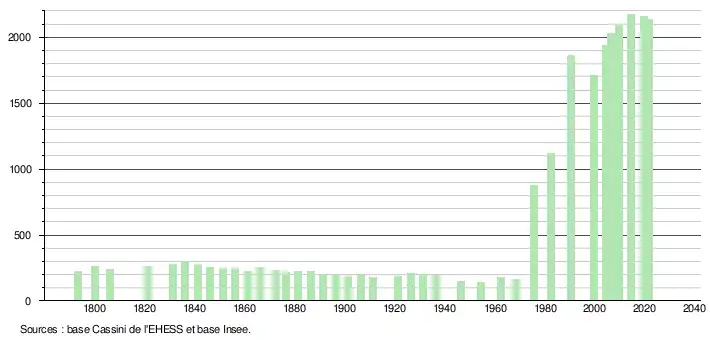 L'évolution du nombre d'habitants est connue à travers les recensements de la population effectués dans la commune depuis 1793. Pour les communes de moins de 10 000 habitants, une enquête de recensement portant sur toute la population est réalisée tous les cinq ans, les populations légales des années intermédiaires étant quant à elles estimées par interpolation ou extrapolation[20]. Pour la commune, le premier recensement exhaustif entrant dans le cadre du nouveau dispositif a été réalisé en 2004[21].