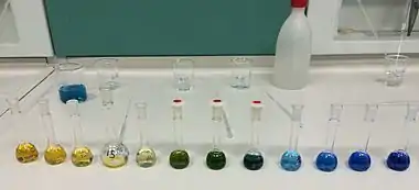 ![]() De gauche à droite : solution de HCl à 0,1 M, 3 solutions tampon de pH=3,78, 3 de pH=4,00, 3 de pH=4,62 et une solution de NaOH à 0,1 M avec différentes quantités de vert de bromocrésol (les solutions les plus sombres sont celles en ayant le plus.) | ||