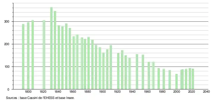 L'évolution du nombre d'habitants est connue à travers les recensements de la population effectués dans la commune depuis 1793. Pour les communes de moins de 10 000 habitants, une enquête de recensement portant sur toute la population est réalisée tous les cinq ans, les populations légales des années intermédiaires étant quant à elles estimées par interpolation ou extrapolation[15]. Pour la commune, le premier recensement exhaustif entrant dans le cadre du nouveau dispositif a été réalisé en 2007[16].