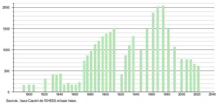 L'évolution du nombre d'habitants est connue à travers les recensements de la population effectués dans la commune depuis 1793. Pour les communes de moins de 10 000 habitants, une enquête de recensement portant sur toute la population est réalisée tous les cinq ans, les populations légales des années intermédiaires étant quant à elles estimées par interpolation ou extrapolation[23]. Pour la commune, le premier recensement exhaustif entrant dans le cadre du nouveau dispositif a été réalisé en 2006[24].