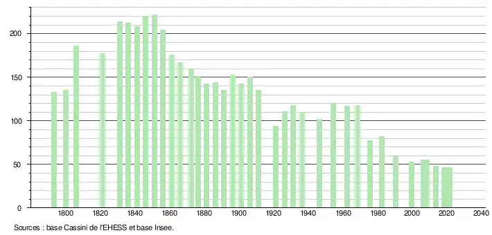 L'évolution du nombre d'habitants est connue à travers les recensements de la population effectués dans la commune depuis 1793. Pour les communes de moins de 10 000 habitants, une enquête de recensement portant sur toute la population est réalisée tous les cinq ans, les populations légales des années intermédiaires étant quant à elles estimées par interpolation ou extrapolation[15]. Pour la commune, le premier recensement exhaustif entrant dans le cadre du nouveau dispositif a été réalisé en 2008[16].