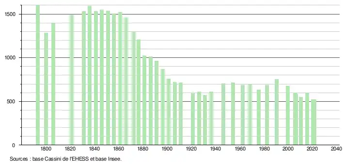 L'évolution du nombre d'habitants est connue à travers les recensements de la population effectués dans la commune depuis 1793. Pour les communes de moins de 10 000 habitants, une enquête de recensement portant sur toute la population est réalisée tous les cinq ans, les populations légales des années intermédiaires étant quant à elles estimées par interpolation ou extrapolation[26]. Pour la commune, le premier recensement exhaustif entrant dans le cadre du nouveau dispositif a été réalisé en 2005[27].