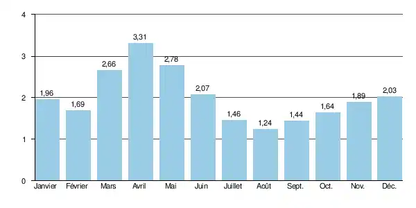 | 2012 | 2.14 | 4.38 (décembre) | 12.5 (26 décembre) | 32 (9 octobre) | |||