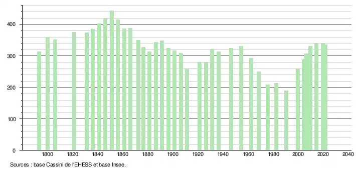 L'évolution du nombre d'habitants est connue à travers les recensements de la population effectués dans la commune depuis 1793. Pour les communes de moins de 10 000 habitants, une enquête de recensement portant sur toute la population est réalisée tous les cinq ans, les populations légales des années intermédiaires étant quant à elles estimées par interpolation ou extrapolation[14]. Pour la commune, le premier recensement exhaustif entrant dans le cadre du nouveau dispositif a été réalisé en 2004[15].