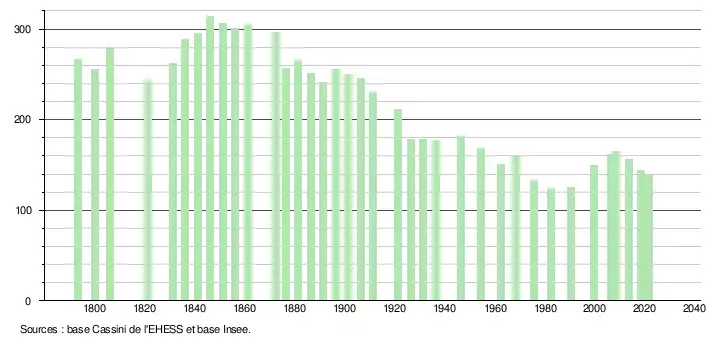 L'évolution du nombre d'habitants est connue à travers les recensements de la population effectués dans la commune depuis 1793. Pour les communes de moins de 10 000 habitants, une enquête de recensement portant sur toute la population est réalisée tous les cinq ans, les populations légales des années intermédiaires étant quant à elles estimées par interpolation ou extrapolation[19]. Pour la commune, le premier recensement exhaustif entrant dans le cadre du nouveau dispositif a été réalisé en 2008[20].