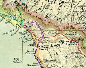 Vers ces dernières localités, la via Clodia Nova rencontre de nombreux sentiers muletiers qui traversent le fleuve, en provenance de l’Emilie, descendent des Apennins vers la vallée de Lucques.