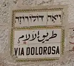 Même si certaines rues de Jérusalem sont signalées en anglais, en hébreu et en arabe sur les différents panneaux, on peut trouver aussi indiqué sur le mur l'inscription Via Dolorosa.
