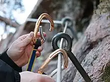 - un équipement de via ferrata avec un baudrier, des mousquetons et des longes pour se relier au câble, un absorbeur pour amortir une chute éventuelle ;