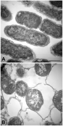 Coupe transversale au microscope électronique à transmission de Yersinia pestis en croissance active (Groupe A) et non cultivables (Groupe B). Échelle à 0,5 micron.