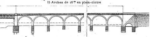 Les dispositions définitivement adoptées consistent en des pleins cintres de 16 mètres d'ouverture tant que la hauteur disponible le permet, ensuite on passe, par l'intermédiaire d'arches de transition, à des voûtes de même ouverture surbaissées au tiers environ[6], puis successivement à des voûtes surbaissées de 15, 14 et 13 mètres d'ouverture.