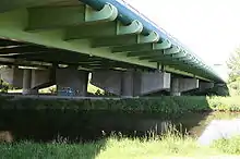 L’ouvrage est composé de deux structures : un arc bow-string visible sur et hors autoroute, au droit du canal, ouvrage typique des voies d’eau ; un pont à poutres continues, ouvrage discret et plus commun pour le franchissement de la rivière contigüe.
