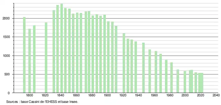 | L'évolution du nombre d'habitants est connue à travers les recensements de la population effectués dans la commune depuis 1793. Pour les communes de moins de 10 000 habitants, une enquête de recensement portant sur toute la population est réalisée tous les cinq ans, les populations légales des années intermédiaires étant quant à elles estimées par interpolation ou extrapolation[40]. Pour la commune, le premier recensement exhaustif entrant dans le cadre du nouveau dispositif a été réalisé en 2008[41]. En 2021, la commune comptait 533 habitants[Note 8], en diminution de 1,66 % par rapport à 2015 (Tarn : +1,82 %, France hors Mayotte : +1,84 %). |