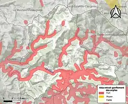 La commune est vulnérable au risque de mouvements de terrains constitué principalement du retrait-gonflement des sols argileux[33]. Cet aléa est susceptible d'engendrer des dommages importants aux bâtiments en cas d’alternance de périodes de sécheresse et de pluie. 26,5 % de la superficie communale est en aléa moyen ou fort (76,3 % au niveau départemental et 48,5 % au niveau national). Sur les 518 bâtiments dénombrés sur la commune en 2019, 321 sont en aléa moyen ou fort, soit 62 %, à comparer aux 90 % au niveau départemental et 54 % au niveau national. Une cartographie de l'exposition du territoire national au retrait gonflement des sols argileux est disponible sur le site du BRGM[34],[Carte 3].