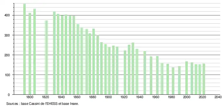 L'évolution du nombre d'habitants est connue à travers les recensements de la population effectués dans la commune depuis 1793. Pour les communes de moins de 10 000 habitants, une enquête de recensement portant sur toute la population est réalisée tous les cinq ans, les populations légales des années intermédiaires étant quant à elles estimées par interpolation ou extrapolation[16]. Pour la commune, le premier recensement exhaustif entrant dans le cadre du nouveau dispositif a été réalisé en 2006[17].