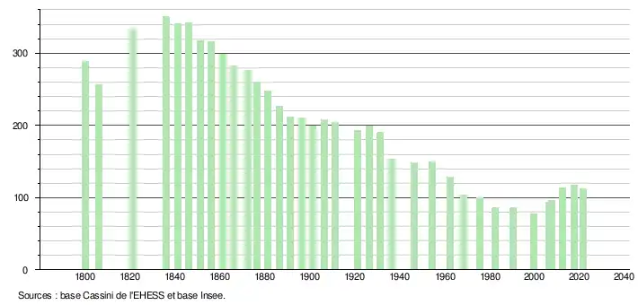 L'évolution du nombre d'habitants est connue à travers les recensements de la population effectués dans la commune depuis 1800. Pour les communes de moins de 10 000 habitants, une enquête de recensement portant sur toute la population est réalisée tous les cinq ans, les populations légales des années intermédiaires étant quant à elles estimées par interpolation ou extrapolation[13]. Pour la commune, le premier recensement exhaustif entrant dans le cadre du nouveau dispositif a été réalisé en 2007[14].
