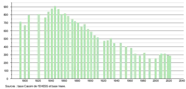 L'évolution du nombre d'habitants est connue à travers les recensements de la population effectués dans la commune depuis 1793. Pour les communes de moins de 10 000 habitants, une enquête de recensement portant sur toute la population est réalisée tous les cinq ans, les populations légales des années intermédiaires étant quant à elles estimées par interpolation ou extrapolation[23]. Pour la commune, le premier recensement exhaustif entrant dans le cadre du nouveau dispositif a été réalisé en 2008[24].
