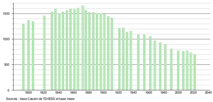L'évolution du nombre d'habitants est connue à travers les recensements de la population effectués dans la commune depuis 1793. Pour les communes de moins de 10 000 habitants, une enquête de recensement portant sur toute la population est réalisée tous les cinq ans, les populations légales des années intermédiaires étant quant à elles estimées par interpolation ou extrapolation[34]. Pour la commune, le premier recensement exhaustif entrant dans le cadre du nouveau dispositif a été réalisé en 2006[35].