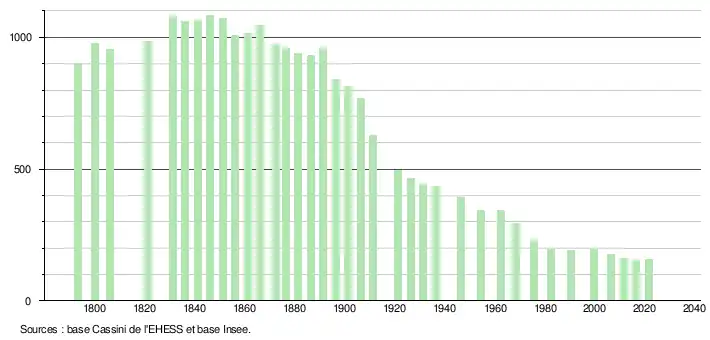 L'évolution du nombre d'habitants est connue à travers les recensements de la population effectués dans la commune depuis 1793. Pour les communes de moins de 10 000 habitants, une enquête de recensement portant sur toute la population est réalisée tous les cinq ans, les populations légales des années intermédiaires étant quant à elles estimées par interpolation ou extrapolation[14]. Pour la commune, le premier recensement exhaustif entrant dans le cadre du nouveau dispositif a été réalisé en 2006[15].