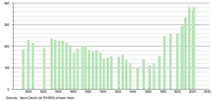 L'évolution du nombre d'habitants est connue à travers les recensements de la population effectués dans la commune depuis 1793. Pour les communes de moins de 10 000 habitants, une enquête de recensement portant sur toute la population est réalisée tous les cinq ans, les populations légales des années intermédiaires étant quant à elles estimées par interpolation ou extrapolation[20]. Pour la commune, le premier recensement exhaustif entrant dans le cadre du nouveau dispositif a été réalisé en 2005[21].