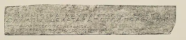 « Μεσσάνιοι καὶ Ναυπάκτιοι ἀνέθεν Διὶ / Ολυμπίωι δεκάταν ἀπὸ τῶν πολεμίων