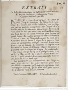 - « Extrait de la renonciation faite par sa Majesté Victor-Amedee II Roy de Sardaigne, en faveur du prince Charles-Emmanuel, son fils », Paris chez Gonichon, 1730 (Lire en ligne).