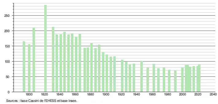 L'évolution du nombre d'habitants est connue à travers les recensements de la population effectués dans la commune depuis 1793. Pour les communes de moins de 10 000 habitants, une enquête de recensement portant sur toute la population est réalisée tous les cinq ans, les populations légales des années intermédiaires étant quant à elles estimées par interpolation ou extrapolation[24]. Pour la commune, le premier recensement exhaustif entrant dans le cadre du nouveau dispositif a été réalisé en 2004[25].