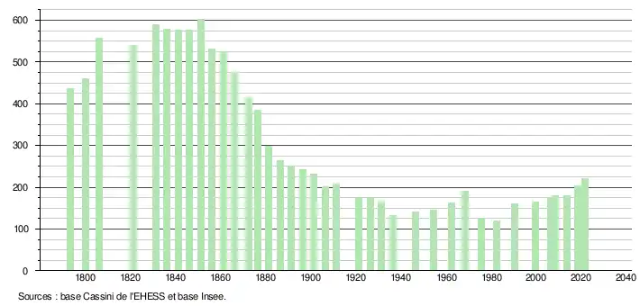 L'évolution du nombre d'habitants est connue à travers les recensements de la population effectués dans la commune depuis 1793. Pour les communes de moins de 10 000 habitants, une enquête de recensement portant sur toute la population est réalisée tous les cinq ans, les populations légales des années intermédiaires étant quant à elles estimées par interpolation ou extrapolation[25]. Pour la commune, le premier recensement exhaustif entrant dans le cadre du nouveau dispositif a été réalisé en 2008[26].