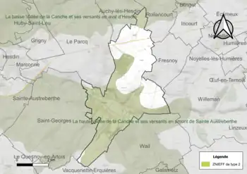 - la haute vallée de la Canche et ses versants en amont de Sainte-Austreberthe qui se situe dans le pays du Ternois. Il offre un relief de coteau abrupt au Nord et des pentes douces au Sud. Le fond de vallée est constitué de pâturages et de zones de cultures. Les versants les plus pentus et inaccessibles accueillent des boisements[13].
