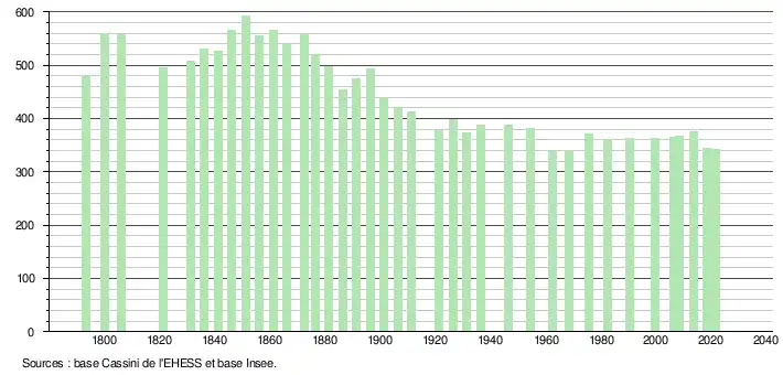 L'évolution du nombre d'habitants est connue à travers les recensements de la population effectués dans la commune depuis 1793. Pour les communes de moins de 10 000 habitants, une enquête de recensement portant sur toute la population est réalisée tous les cinq ans, les populations légales des années intermédiaires étant quant à elles estimées par interpolation ou extrapolation[39]. Pour la commune, le premier recensement exhaustif entrant dans le cadre du nouveau dispositif a été réalisé en 2008[40].
