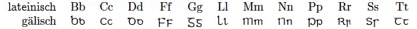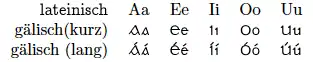 Voici quelques exemples de comparaison entre le Cló Gaelach du vieil irlandais et l'alphabet latin moderne de l'irlandais moderne :
