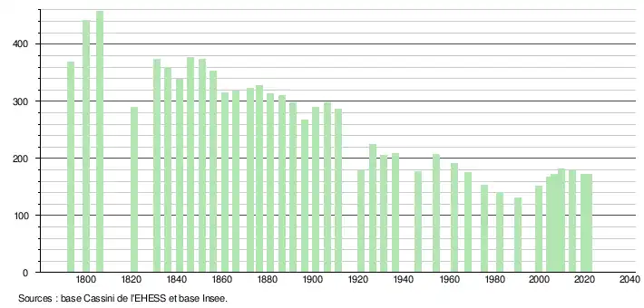 L'évolution du nombre d'habitants est connue à travers les recensements de la population effectués dans la commune depuis 1793. Pour les communes de moins de 10 000 habitants, une enquête de recensement portant sur toute la population est réalisée tous les cinq ans, les populations légales des années intermédiaires étant quant à elles estimées par interpolation ou extrapolation[23]. Pour la commune, le premier recensement exhaustif entrant dans le cadre du nouveau dispositif a été réalisé en 2004[24].