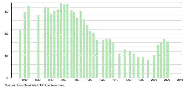 L'évolution du nombre d'habitants est connue à travers les recensements de la population effectués dans la commune depuis 1793. Pour les communes de moins de 10 000 habitants, une enquête de recensement portant sur toute la population est réalisée tous les cinq ans, les populations légales des années intermédiaires étant quant à elles estimées par interpolation ou extrapolation[29]. Pour la commune, le premier recensement exhaustif entrant dans le cadre du nouveau dispositif a été réalisé en 2005[30].