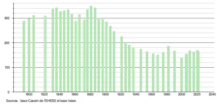 L'évolution du nombre d'habitants est connue à travers les recensements de la population effectués dans la commune depuis 1793. Pour les communes de moins de 10 000 habitants, une enquête de recensement portant sur toute la population est réalisée tous les cinq ans, les populations légales des années intermédiaires étant quant à elles estimées par interpolation ou extrapolation[42]. Pour la commune, le premier recensement exhaustif entrant dans le cadre du nouveau dispositif a été réalisé en 2005[43].
