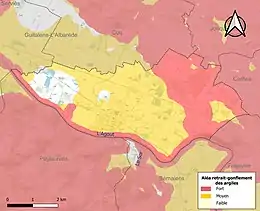 La commune est vulnérable au risque de mouvements de terrains constitué principalement du retrait-gonflement des sols argileux[28]. Cet aléa est susceptible d'engendrer des dommages importants aux bâtiments en cas d’alternance de périodes de sécheresse et de pluie. 90,3 % de la superficie communale est en aléa moyen ou fort (76,3 % au niveau départemental et 48,5 % au niveau national). Sur les 645 bâtiments dénombrés sur la commune en 2019, 622 sont en aléa moyen ou fort, soit 96 %, à comparer aux 90 % au niveau départemental et 54 % au niveau national. Une cartographie de l'exposition du territoire national au retrait gonflement des sols argileux est disponible sur le site du BRGM[29],[Carte 3].